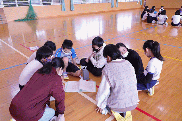 担当の先生から、登校時刻について、あいさつについて、困っていることはないかという話があり、それを受けて地区ごとの班長と副班長とそれぞれの地区の担当の先生とで話し合いをしました。