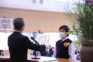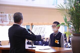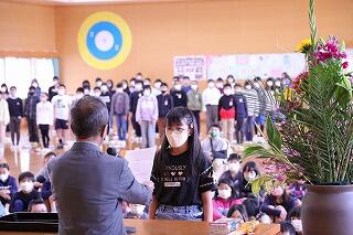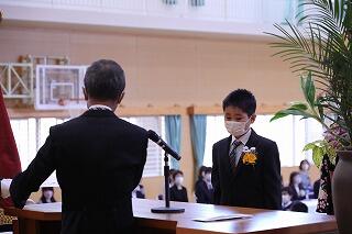 各学年の代表児童が校長先生より終了証書を受け取りました。この時は、その学年の児童も全員起立し、代表児童に合わせて礼をしました。