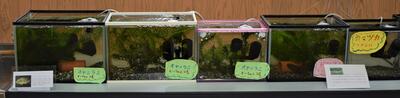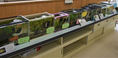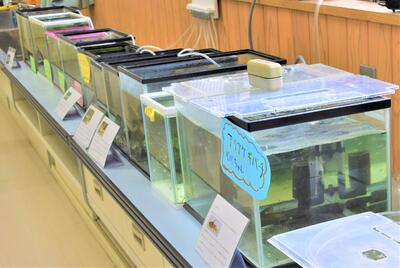 理科室に水族館ができました。理科専科の中村先生は、魚が大好きで、その生態についてもとても詳しいです。とくに、理科室に来る子どもたちは、目を輝かせて見ているようです。