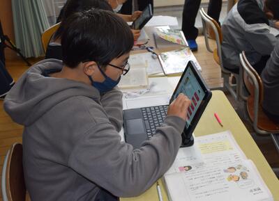 今年度、本校は『ICT活用推進モデル校』になっています。授業の中でICTを有効に活用することについての研究は、昨年から取り組んでいました。11月30日は、この2年間の子どもたちや先生方の取組についての発表を行いました。町内外からたくさんの先生方が来られ、子どもたちが一生懸命に学習に取り組んでいる様子を見ていただきました。