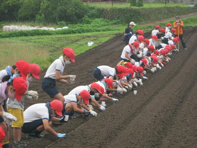 5年生は、7月に大豆の種まきをしました。そして、5か月後の先日(12月8日)、その収穫をしました。種まきの日は、あいにくの雨模様の日でしたが、収穫の今回は晴れて暖かい収穫日和でした。子どもたちは、一生懸命に収穫をがんばりました。