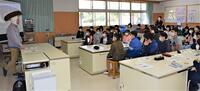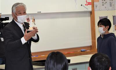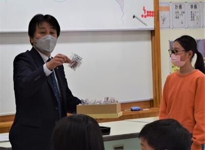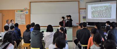 6年生は、三田井地区にある株式会社杉本商店代表取締役社長の杉本和英様による講話を聴きました。これは、6年生が2学期に、高千穂の特産物であるシイタケについて調べに杉本商店に行ったことがきっかけでした。