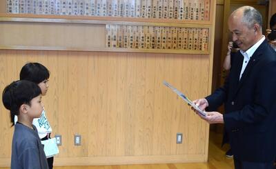 高千穂町防犯協会から1年生の子どもたちに「いかのおすし」防犯グッズが送られました。1年生47名を代表して、2名の児童がもらいました。「いかのおすし」を守って、安全な生活が送れるようになるといいです。
