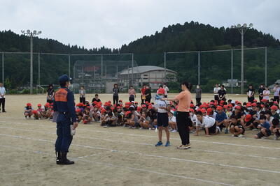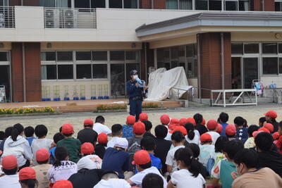 避難後は、全児童を対象に消防の方からの「火災防止」のお話を伺うことができました。