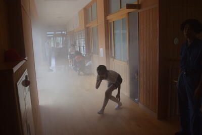 また、高学年を対象に煙体験が行われ、煙が発生しているときに前が見えない状態で移動することの困難さや低い姿勢で呼吸することの大切さを体験することができました。