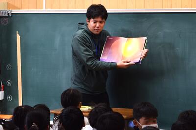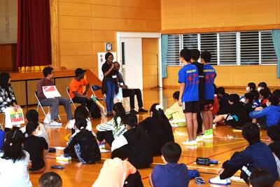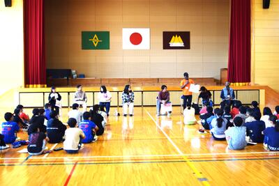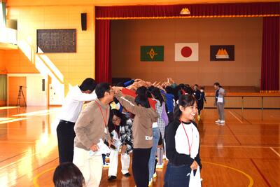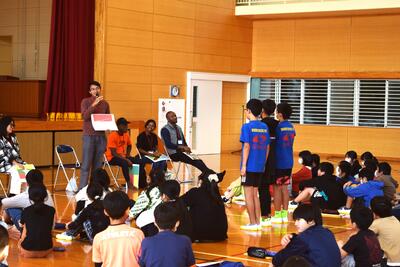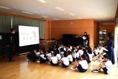 10月19日(木)に、本校体育館にて「熊本大学高千穂塾」が行われ、6年生が交流会に参加しました。本町在住で熊本大学名誉教授の吉玉國二郎様が熊本大学と本校をつないでくださり、熊本大学から留学生、学部生、職員(副学長他)の方々が来校されました。