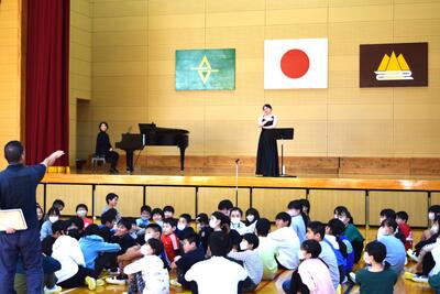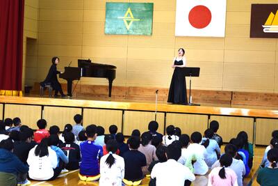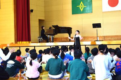 令和5年11月21日(火)に、5・6年生を対象とした『気楽にクラッシックに触れる会』が本校体育館で開催されました。歌い手は、国立音楽大を経て音楽活動をされている山田麻央さん、ピアノ伴奏者は、日之影町でピアノ教室をされている戸髙愛さんです。