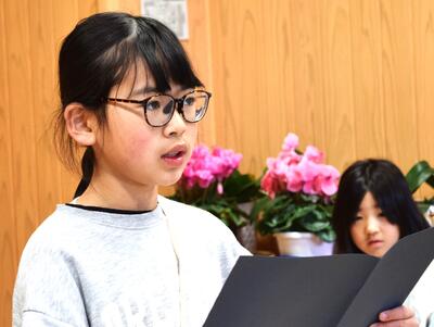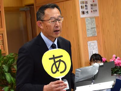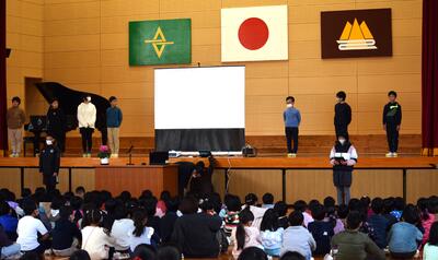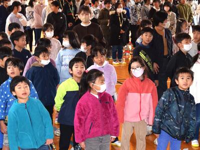 昔の高千穂小学校をクイズ形式で紹介したり、「音楽のおくりもの」「校歌」を歌ったりしました。