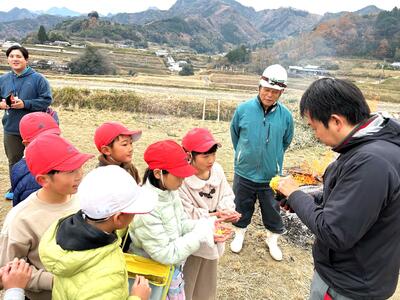 棚田の素晴らしい眺めのもと、子どもたちは棚田の歴史や地形、人々の願いなどのお話を伺うとともに、たき火体験をしたり焼き芋をいただいたりしながら、楽し時間を過ごすことができました。