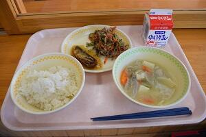 麦ごはん、豚汁、いわし甘露煮、ゆかりあえ、牛乳