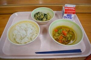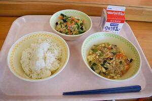 麦ごはん、かぼちゃのそぼろ煮、三色あえ、牛乳