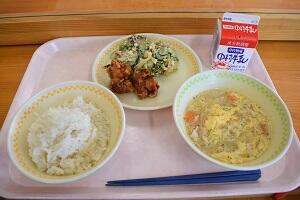 麦ごはん、洋風かきたま汁、とりのからあげ、納豆サラダ、牛乳