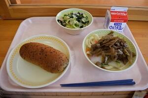 ごまパン、地頭鶏神楽うどん、大根とツナのサラダ、牛乳