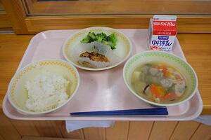 麦ごはん、鶏肉の西京焼き、ブロッコリー、みぞれ汁、牛乳