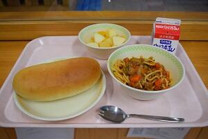 黒糖パン、スパゲティミートソース、杏仁豆腐、牛乳