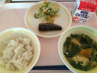 麦ごはん 牛乳 かぼちゃのみそ汁 いわしのかんろ煮 そえ野菜