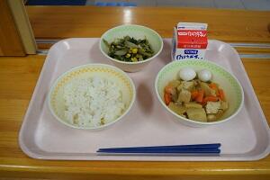 麦ごはん、高野豆腐と昆布の炒り煮、ごぼうのサラダ、牛乳