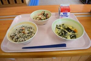 ひじきごはん、かみかみピーマンの白あえ、かきたま汁、牛乳