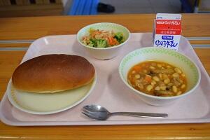 コッペパン、ちゃんぽん、かみかみ大豆と小魚の揚げ煮、牛乳