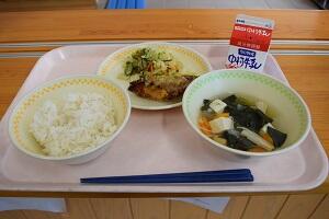 麦ごはん・牛乳・とりの唐揚げ・添え野菜・魚そうめん汁