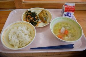 麦ごはん、白菜と肉団子のスープ、ブロッコリー、いわしの変わり揚げ、牛乳
