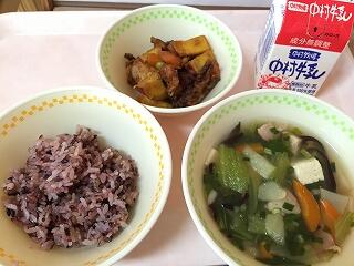 十二穀米 牛乳 五目豆腐スープ 鶏肉とさつまいもの揚げ煮