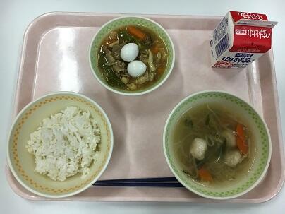 麦ごはん、牛乳、八宝菜、つくねスープ