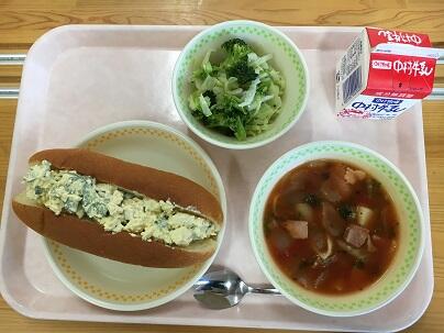 卵サンド、牛乳、ミネストローネ、グリーンサラダ
