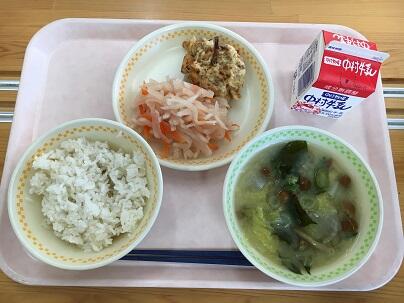 麦ごはん、牛乳、大豆のかき揚げ、梅肉あえ、なめこと野菜のみそ汁