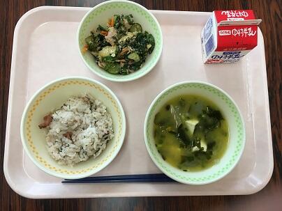 たこごはん、牛乳、黒皮かぼちゃのみそ汁、千草あえ