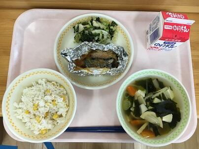 コーンごはん、牛乳、さばホイル焼き、おかかあえ、たけのこすまし汁