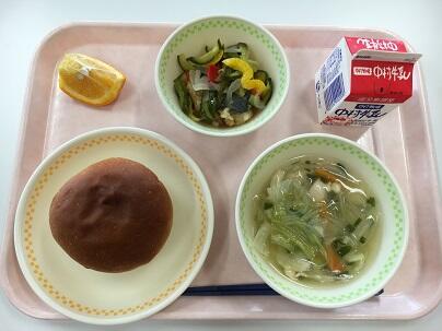 紅芋パン、牛乳、魚のエスカベッシュ、マロニースープ、あまなつ