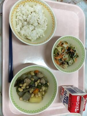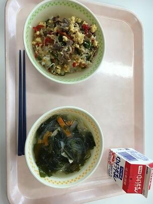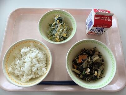 麦ごはん、牛乳、ひじきの炒り煮、バンサンスー