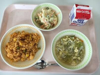 メキシカンライス、牛乳、ポテトサラダ、卵とレタスのスープ