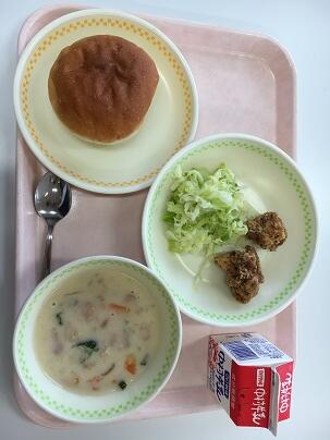 コッペパン、牛乳、ブラジル風唐揚げ、野菜のレモンあえ、カルル