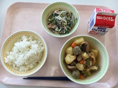 麦ごはん、牛乳、鶏肉とじゃがいもの煮物、いそマヨネーズあえ