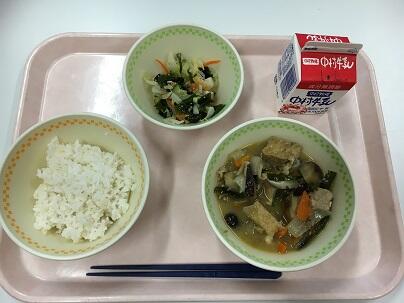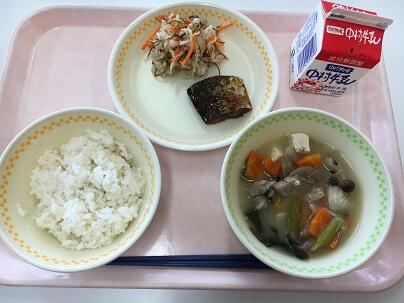 麦ごはん、牛乳、さばの照り煮、はりはりづけ、みそのっぺい汁