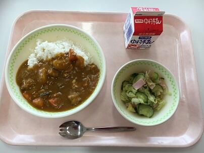夏野菜カレー、牛乳、日向夏ドレッシングサラダ