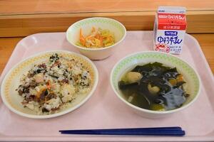山菜おこわ・牛乳・和風マリネ・かきたま汁