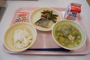 麦ごはん・牛乳・いわしのおかかに・キャベツのレモンあえ・さつま汁