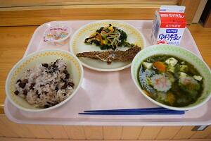 赤飯・牛乳・さばゴマ衣焼き・小松菜のあえもの・あおさ汁・お祝いデザート