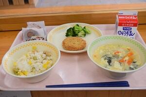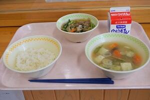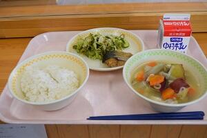 麦ごはん、かぼちゃのそぼろ煮、おからサラダ、牛乳