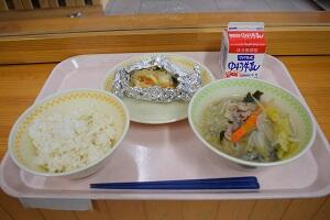 麦ごはん、魚のホイル蒸し、マロニースープ、牛乳