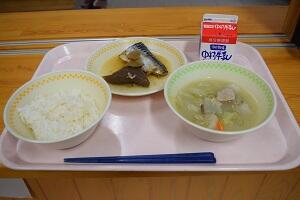 麦ごはん、煮魚、こんにゃく、豚汁、牛乳