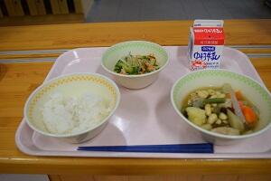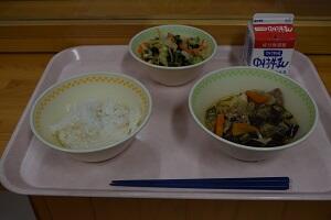 麦ごはん、高野豆腐の炒り煮、酢みそあえ、牛乳