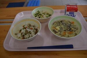 とりめし、かみかみサラダ、もずくのスープ、牛乳