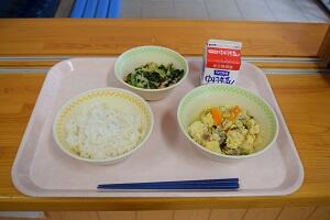 麦ごはん、かぼちゃのそぼろ煮、ごまみそあえ、牛乳