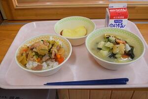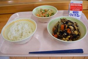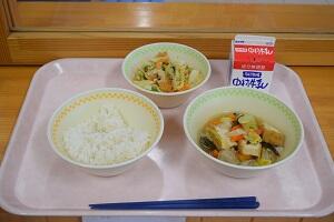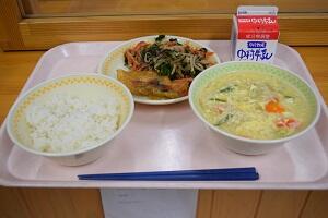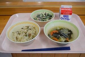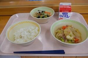 麦ごはん、いわしのしょうが煮、野菜のレモンあえ、みそけんちん汁、牛乳