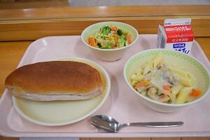 紅芋パン、ペンネのクリームソース、アスパラとブロッコリーのサラダ、牛乳