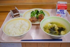 麦ごはん、とりのからあげ、ブロッコリー、かぼちゃのみそ汁、牛乳、セレクトケーキ